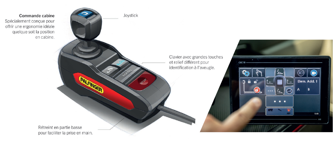La commande cabine avec son mono-josytick contrôle précisement les mouvements de la benne pendant que l’écran informe l’opérateur de la position du bras dans son environnement.