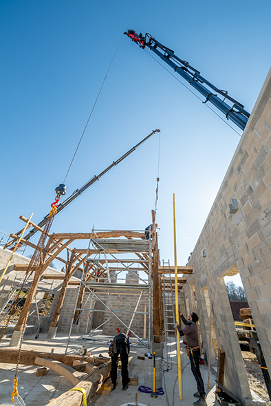 Le dernier projet en date de CHARPENTES PAYS DE BRAY, situé à Chambors, illustre parfaitement leur expertise. Ce chantier exceptionnel de par sa taille a nécessité le levage de 60 tonnes de charpente et 40 à 50 tonnes de couverture dans un rayon de 22 mètres. Grâce à l'utilisation de ses deux grues PALFINGER, l'équipe a pu mener à bien ce projet complexe alliant techniques traditionnels et modernité.